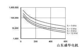 變頻器的載波頻率越高,輸出電流波形越接近正弦波,這會(huì)降低大功率電機(jī)的運(yùn)行溫度,從而延長(zhǎng)絕緣的壽命。但是,更高的載波頻率意味著每秒鐘產(chǎn)生的尖峰電壓數(shù)量更多,對(duì)電機(jī)的沖擊的次數(shù)更多。圖4給出了絕緣壽命隨著電纜長(zhǎng)度與載波頻率的變化。從圖中可知,對(duì)于200英尺長(zhǎng)的電纜,當(dāng)載波頻率從3kHz提高到12kHz(變化4倍)時(shí),絕緣的壽命從大約8萬(wàn)小時(shí)降低到2萬(wàn)小時(shí)(相差4倍)。
